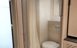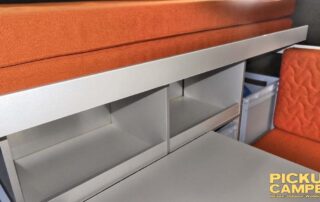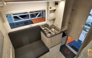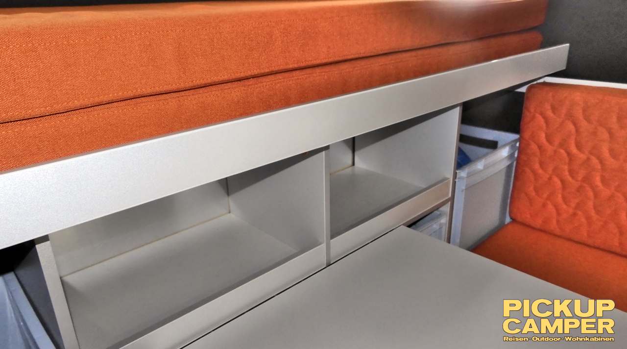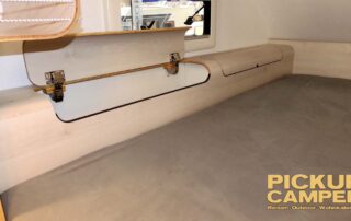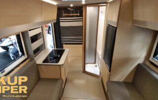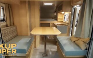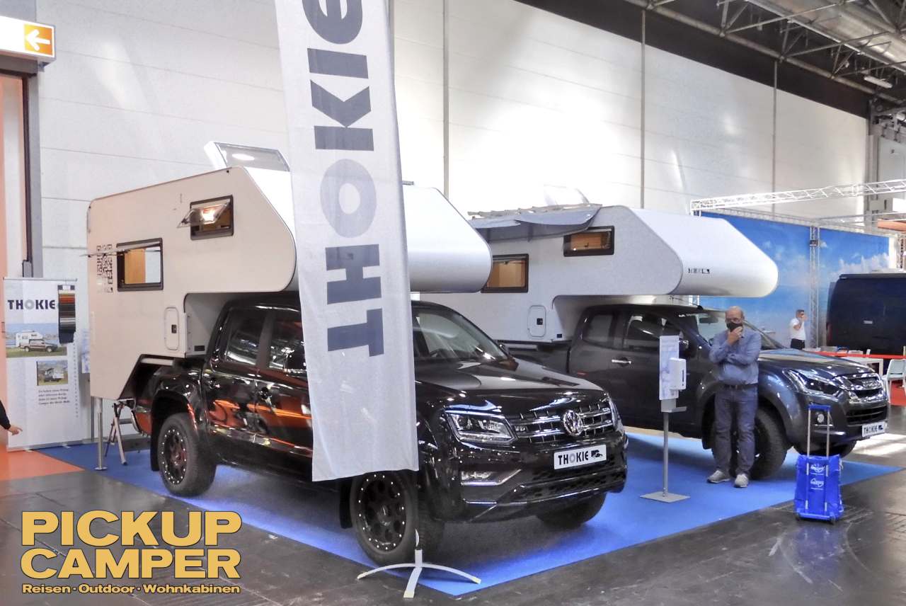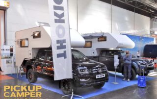Bei Thomas Kiene aus Schwäbisch Hall gibt es „nur“ zwei Modelle. Aber die sind sehr gut ausgedacht, der Innenraum aufgeteilt und freundlich, dass sich Ansehen definitiv lohnt. Mir gefiel besonders die Idee der zusätzliche Staufächer entlang des Bettes im Alkoven und die Lösung für das Abwasser unter der Dusche in einem separaten Tank in der Duschtasse. Auch nicht uninteressant: Die Thokies sind beide so konzipiert, dass die Heckklappe trotz Überhang aufgeklappt dranbleiben kann. Insgesamt strahlt eine Thokie deutsche Gründlichkeit und freundliches Camperdasein aus.