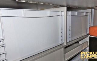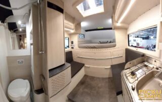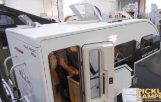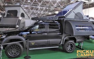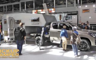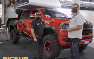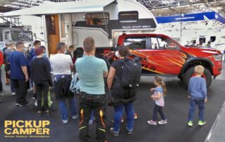 Unübersehbar und als ein echtes Besuchermagnet thront eine der insgesamt drei ausgestellten „Herman RVs“ Kabinen haushoch auf einem prächtig ausgestatteten roten RAM von www.larrystruckstore.de. Erbauer Georg Herman aus Slovenien gab der Kabinenmarke seinen Namen. Hier wurde nicht mit Material gespart. Das Dach ist überlappend und damit ganz sicher wasserdicht, die Wände bestehen aus echter (!!!) Carbonfaser. Das macht die Kabine trotz Vollausstattung leicht und sehr stabil. Die Schränke sind mit Echtholzfurnier veredelt und reagieren auf Antippen ohne sichtbare Schlösser.