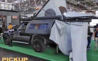 Die türkische Firma Crawler Europe gibt aktuell mächtig Gas. Wir hatten in der ersten gedruckten Ausgabe einen Offroad-Anhänger dieser Marke von „Wheelhouse“, dem deutschen Vertriebspartner. In Düsseldorf zeigt Crawler ein Expeditionsmobil, Anhänger und eine sehr eigenwillige Offroad-Kabinenkostruktion mit vorn angeschlagenem Aufstelldach. Wie schon beim Anhänger sind alle wichtigen Einrichtungen nur von außen zu erreichen. Die Küche ist herausziehbar (und dann für Menschen bis 1,60 m zu hoch angebracht, die Töpfe stehen etwa auf Augenhöhe), der Kühlschrank und das Küchenkabinett öffnen ebenfalls nach außen. Der Alkoven ist nicht etwa über dem Fahrerhaus, sondern klappt nach links extra aus, um Raum im Innern zu schaffen. Schwer zu erklären, muss man gesehen haben. Alles in allem ein Lösung, die eher in wärmeren Gegenden funktioniert als z.B. in Nordeuropa. Bei Wind und Regen möchte man halt nicht gern draußen wohnen, große 90° Markise hin oder her. Immerhin bleibt auf dem Autodach Raum für einen Lastenträger.