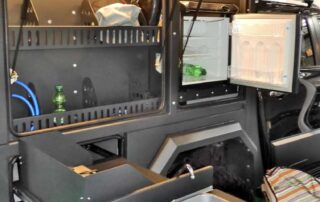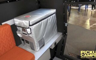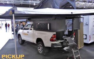 Ganz neu zur Messe brachte Georg Herman eine Offroad-Kabine vom Schlage einer Gazell, Fernwehmobil oder Canopy. Ein Klappdach erweitert den Wohnraum, die schwarze Hülle besteht aus Alu-Riffelblech. Ganz im Stil der Outdoor-Overlander nutzt er Packkisten statt Schubladen zum Verstauen von Material und Ausrüstung. Außendusch-Zelt und 180° Markise erleichtern das Leben draußen.